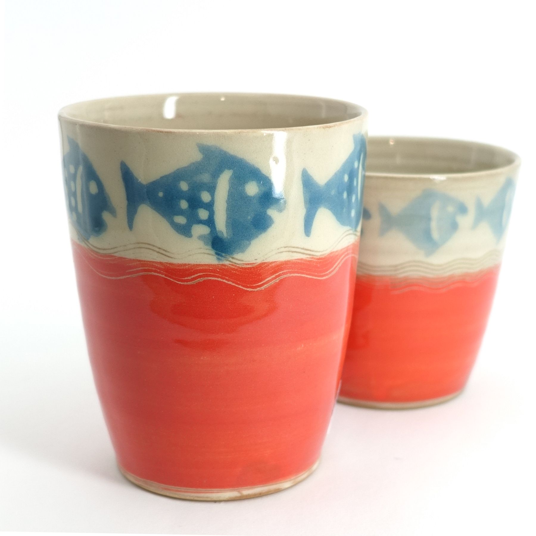 Becher Orange, blauer Fischrand