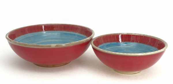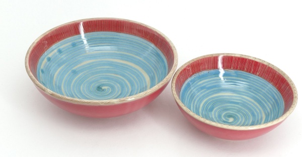 Suppenschalen Rot, blaue Spiralen auf Natur